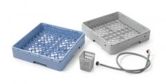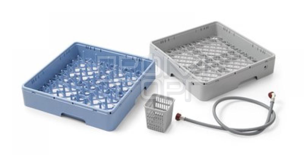 Комплектація: 1 універсальна касета 500x500x(H)105 мм для скляного посуду 1 касета з опорними рейками в конфігурації 5х8 шт., 500x500x(H)105 мм для глибоких та дрібних тарілок 1x100 Перистальтичний дозатор ополіскувача