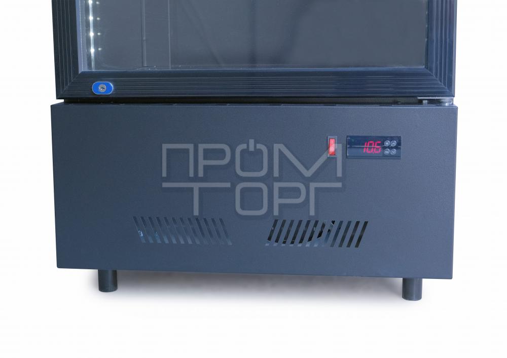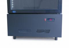 Корпус шафи виконаний із міцної сталі та пофарбований в елегантний чорний колір, що надає йому сучасного та стильного зовнішнього вигляду, а внутрішня камера чорного кольору створює контраст та покращує видимість вмісту. Відсутність верхнього лайтбоксу робить модель компактнішою, а бічне світлодіодне підсвічування білого кольору з двостороннім освітленням додає візуальної привабливості і дозволяє продуктам виділятися.