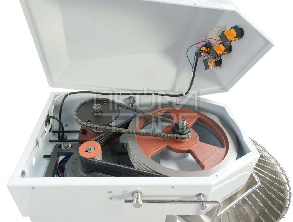 Привід на основі ланцюгової передачі забезпечує надійну роботу механізму, а захисні грати з нержавіючої сталі гарантують безпеку – при її відкритті тістоміс автоматично зупиняється. За один цикл замішування можна обробити від 2 до 16 кг тесту за 12-18 хвилин. Для досягнення найкращих результатів рекомендується завантажувати не більше половини обсягу діжі. Верхній блок механізму нерухомий, а керування здійснюється через просту механічну панель.